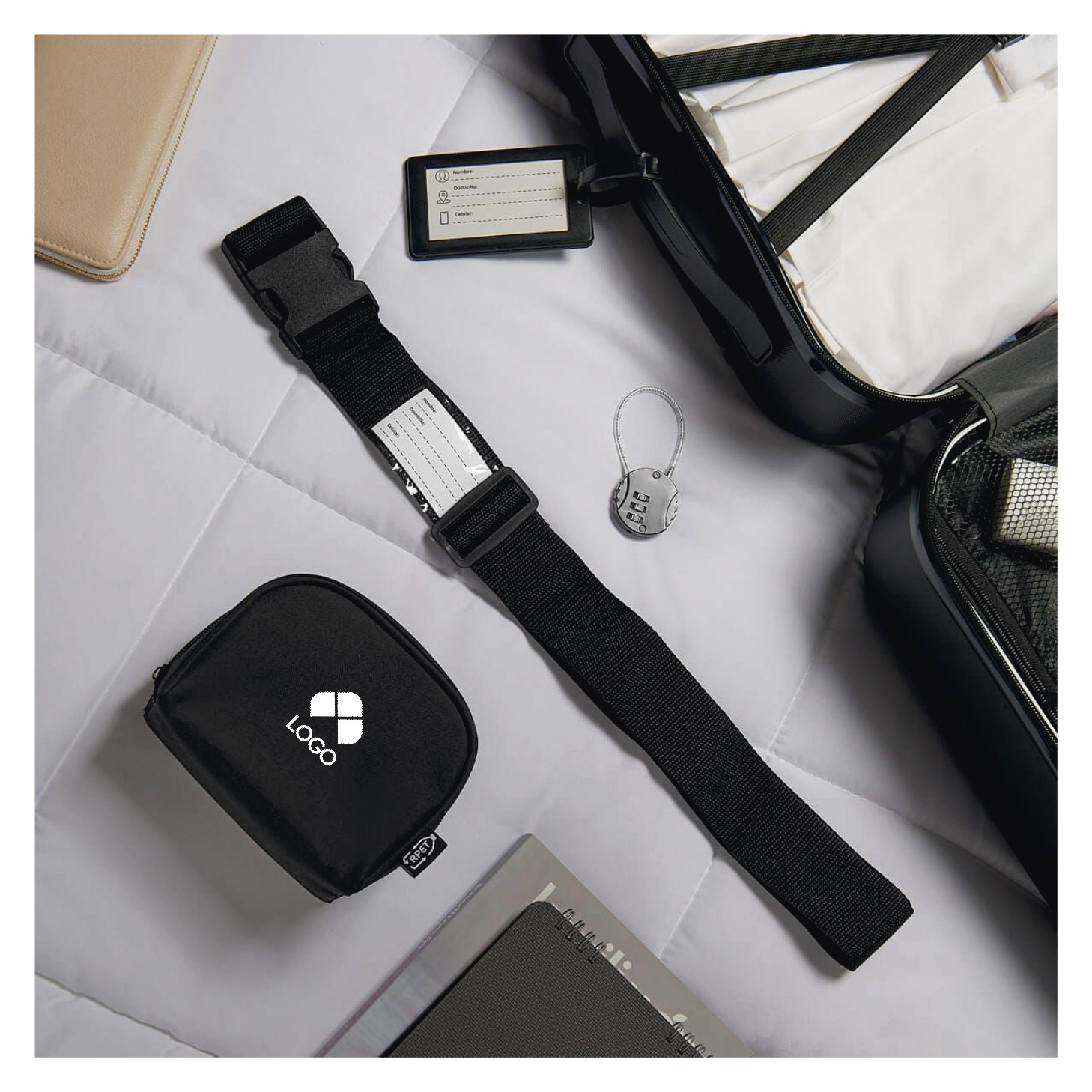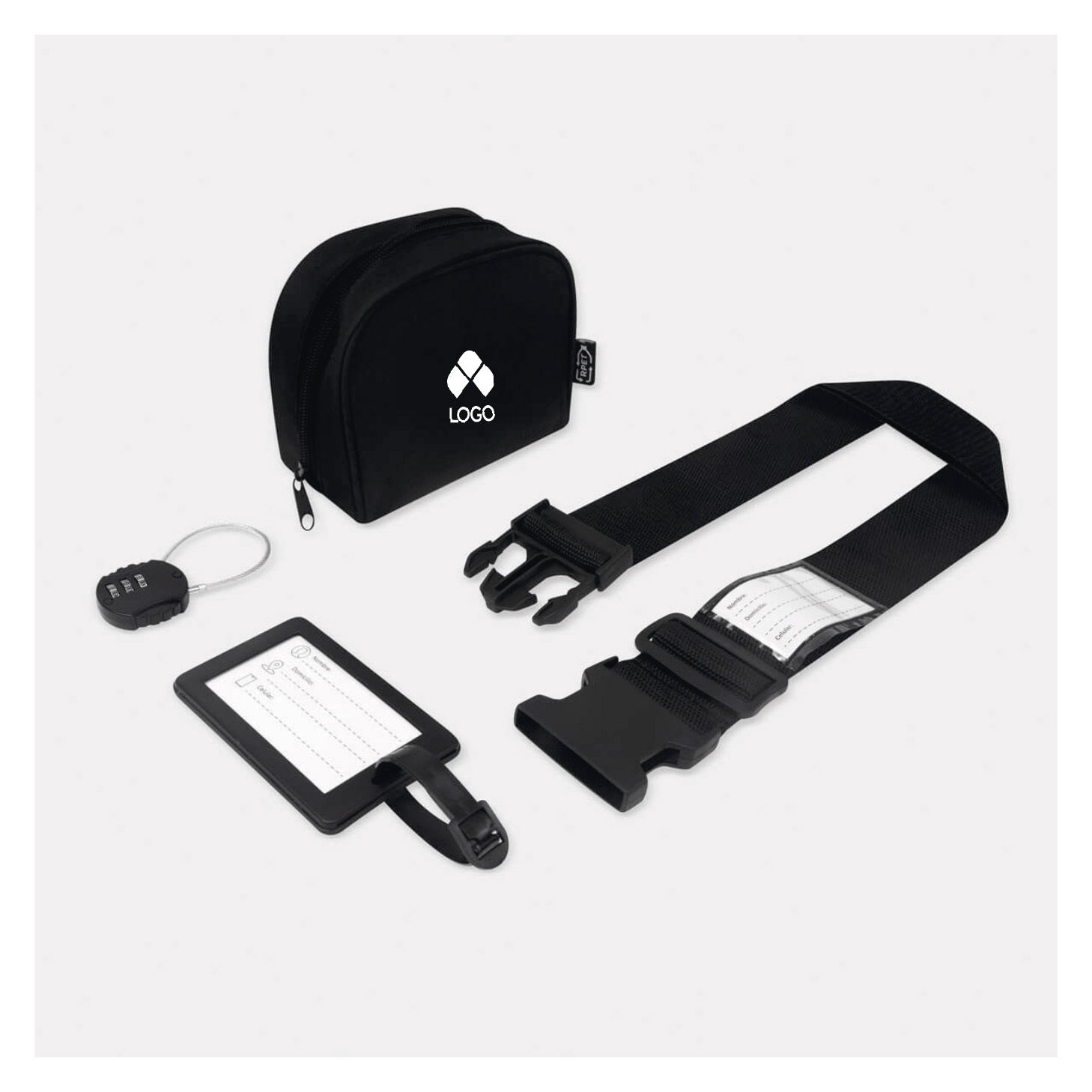 SET DE VIAJE PARA MALETA. INCLUYE CANDADO CON COMBINACION, IDENTIFICADOR, CINTA DE SEGURIDAD CON IDENTIFICADOR INTEGRADO Y ESTUCHE FABRICADO CON MATERIAL RECICLADO. TODO LO ESENCIAL PARA PROTEGER TU EQUIPAJE, EN UN SOLO KIT
