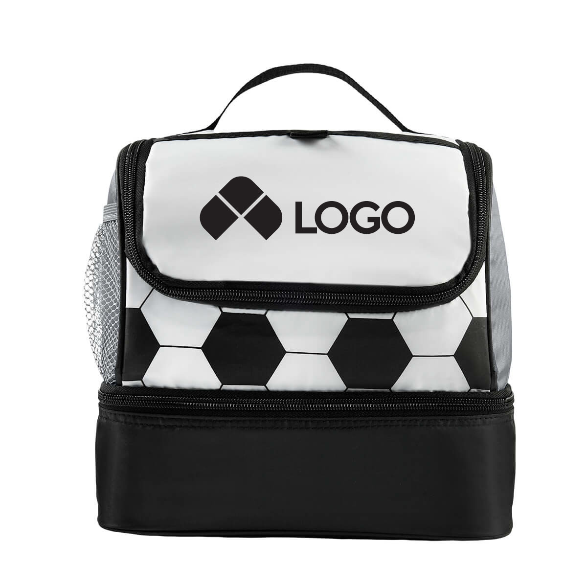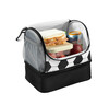 LONCHERA CON INTERIOR PLASTIFICADO. DOBLE COMPARTIMENTO CON CIERRE. BOLSA LATERAL DE RED Y ASA DE AGARRE SUPERIOR. CAPACIDAD PARA 9 LATAS