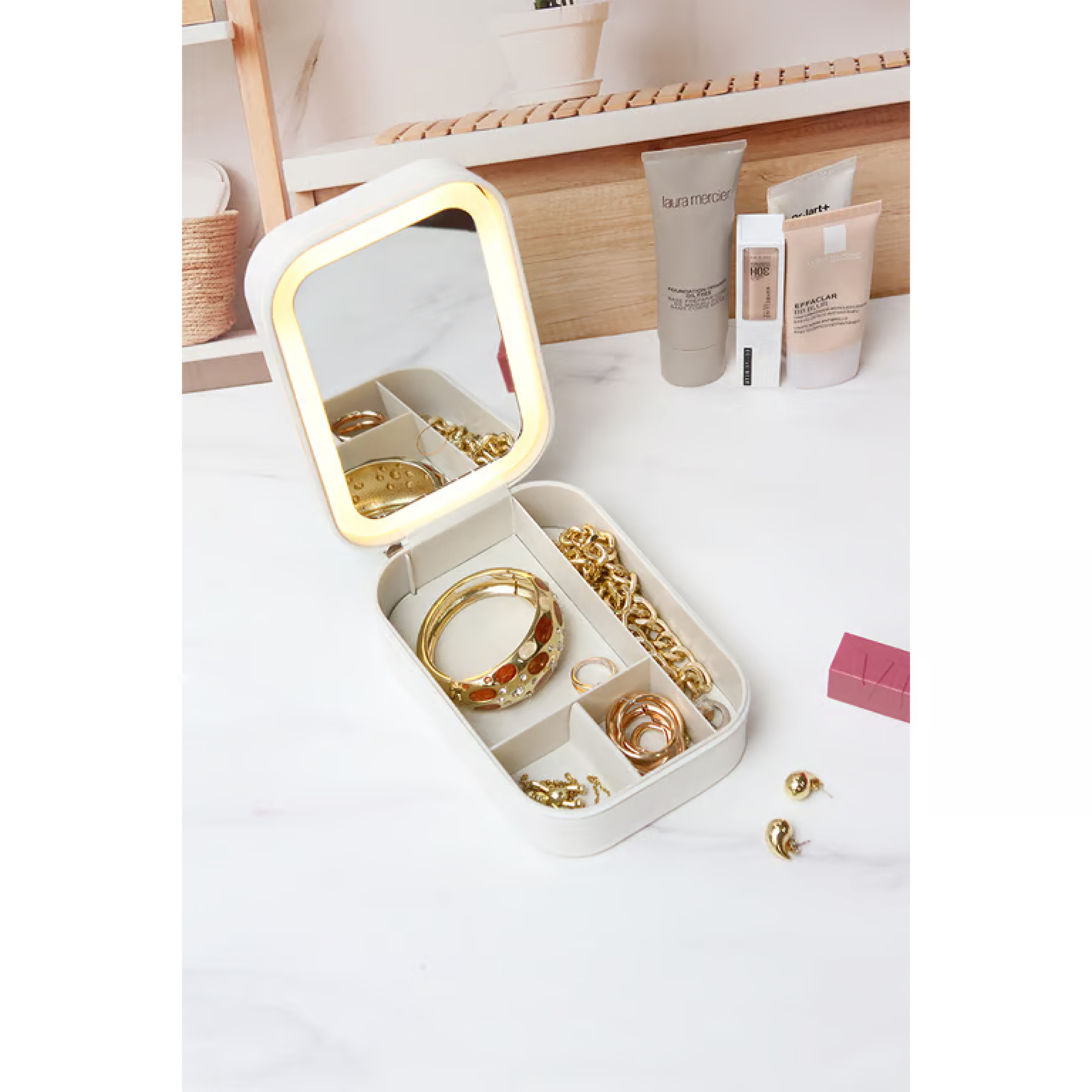 CONTENEDOR PARA ALMACENAR JOYERIA CON ESPEJO CON LUZ LED FABRICADO EN PLASTICO. TRES INTENSIDADES DE LUZ, CUENTA CON VARIOS COMPARTIMENTOS PARA DIFERENTES ARTICULOS Y UN CABLE DE CARGA TIPO USB DE 1 METRO DE LARGO. ES UNA OPCION ELEGANTE Y PRACTICA PARA MANTENER TUS JOYAS ORGANIZADAS Y PROTEGIDAS. CON SUS DIVERSOS COMPARTIMENTOS INTERNOS