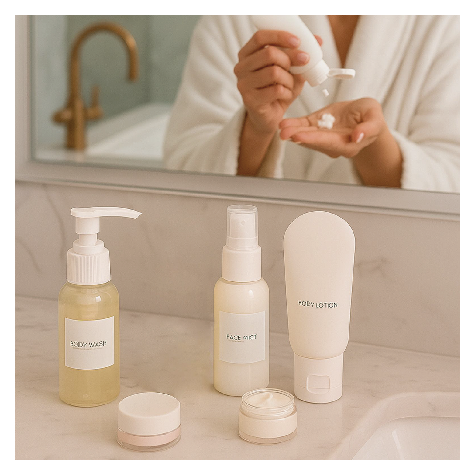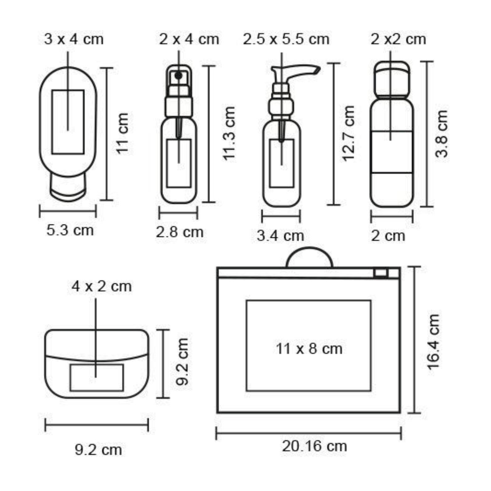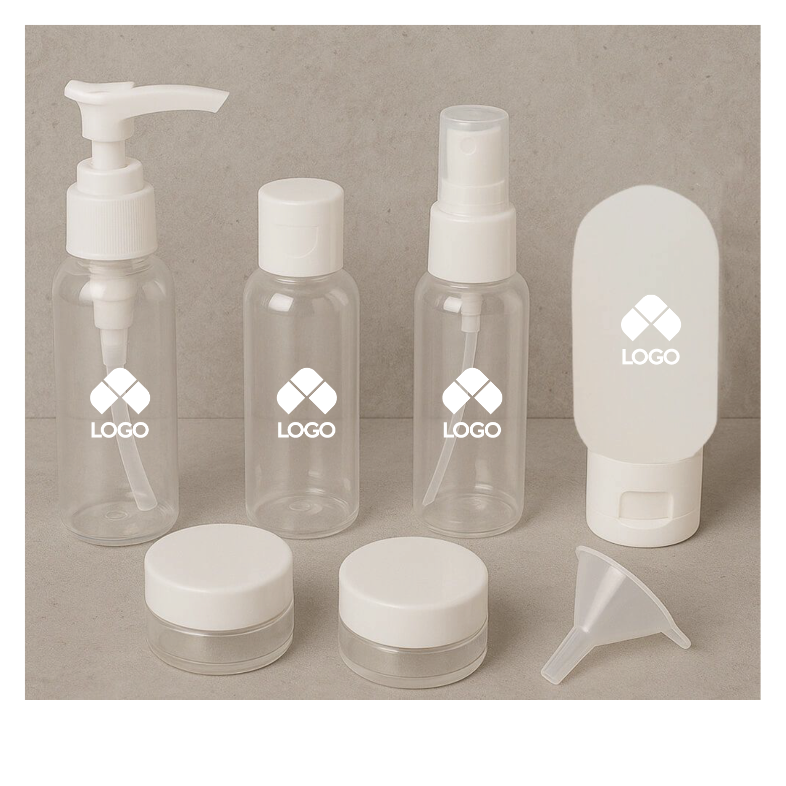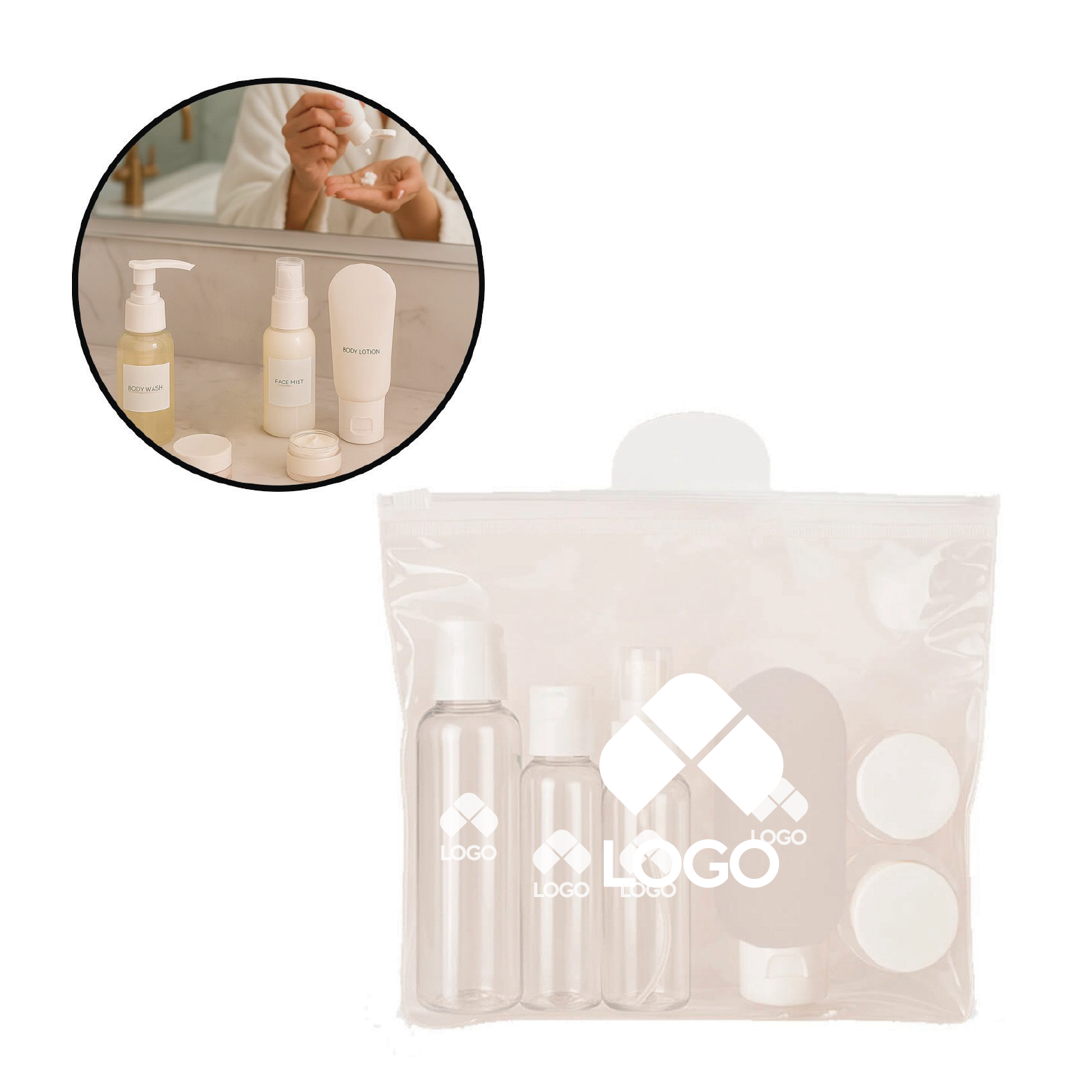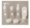 SET DE VIAJE CON 8 ACCESORIOS: 1 ATOMIZADOR, 1 BOTE CON DISPENSADOR, 2 BOTES CON TAPA DISC TOP, 1 BOTE, 1 RECIPIENTE PARA ALMACENAMIENTO, 1 MINI EMBUDO Y 1 PALITA. INCLUYE ESTUCHE