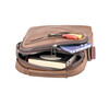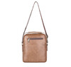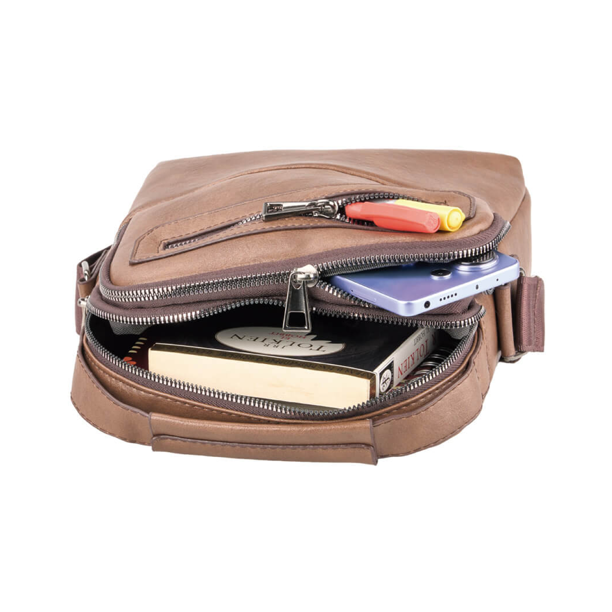 BOLSA DE HOMBRO DE VINIPIEL CON COMPARTIMENTO PRINCIPAL, DOS BOLSILLOS INTERNOS, DOS BOLSILLOS FRONTALES CON CIERRE, BOLSILLO TRASERO CON CIERRE, ASA SUPERIOR Y CORREA AJUSTABLE
