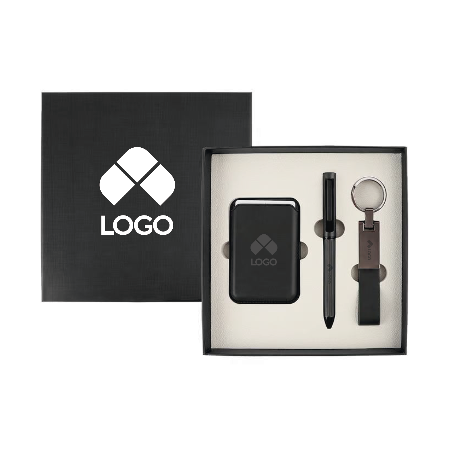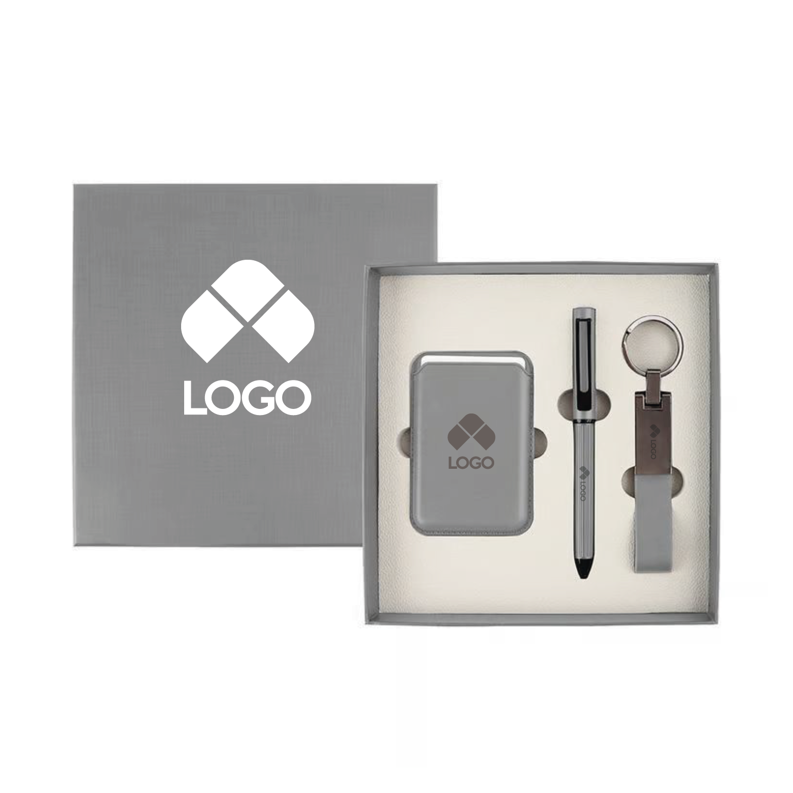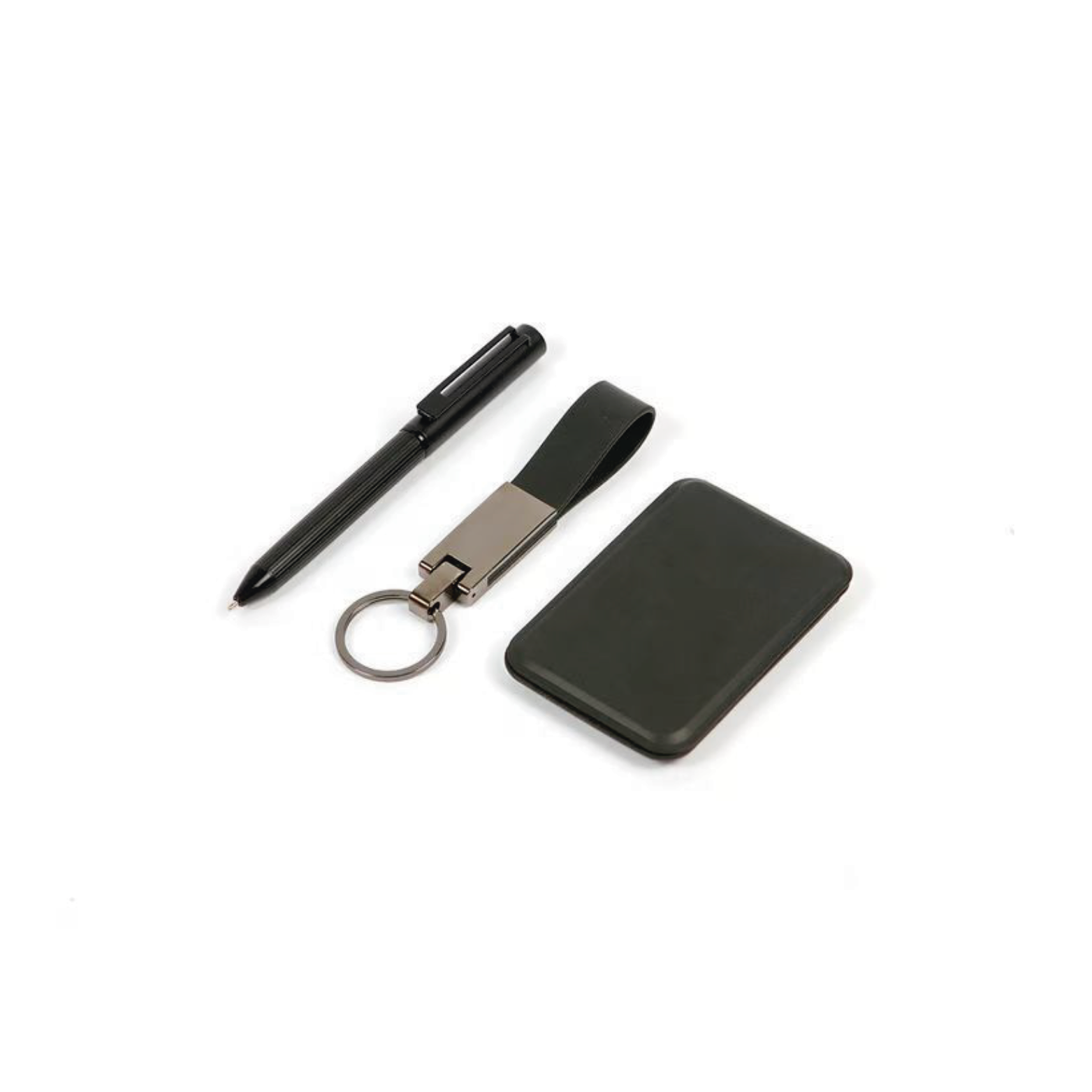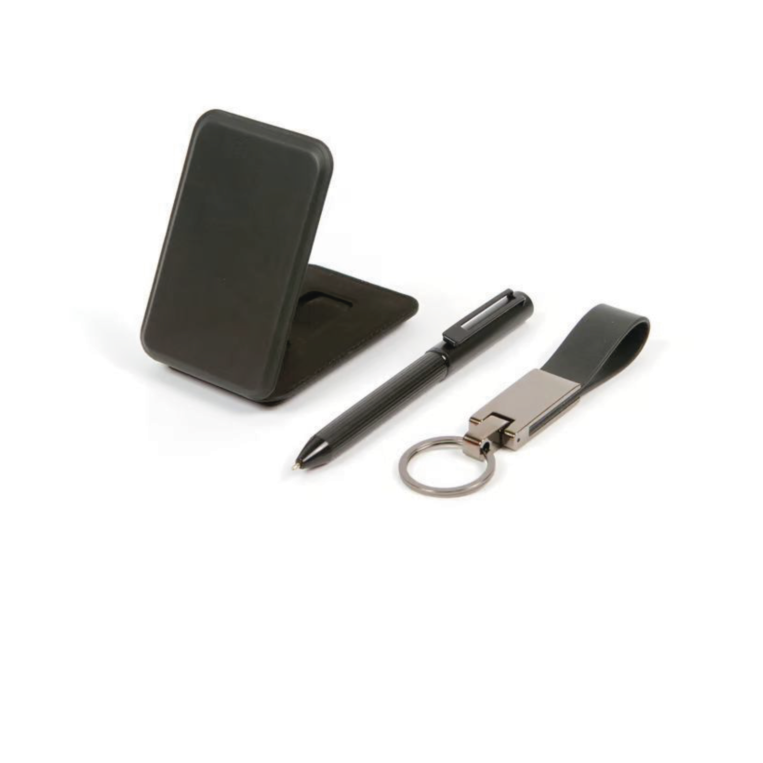 SET EJECUTIVO, INCLUYE UN BOLIGRAFO TIPO BALL PEN CON BARRIL FABRICADO EN ACERO, TINTA DE ESCRITURA NEGRA. UN SOPORTE PARA TELEFONO FABRICADO EN CURPIEL, SU HOJA DE ACERO INOXIDABLE CON IMAN AYUDA A QUE ESTE SE ADHIERA AL TELEFONO CELULAR PARA FUNCIONAR TAMBIEN COMO UN TARJETERO. UN LLAVERO FABRICADO EN ACERO INOXIDABLE CON DETALLES EN CURPIEL. INCLUYE UNA CAJA DE REGALO