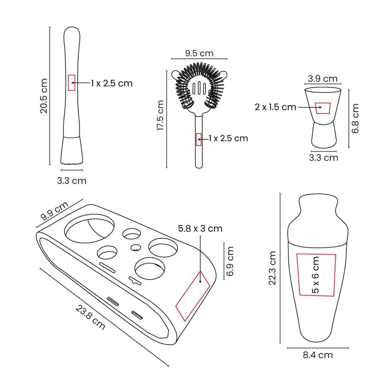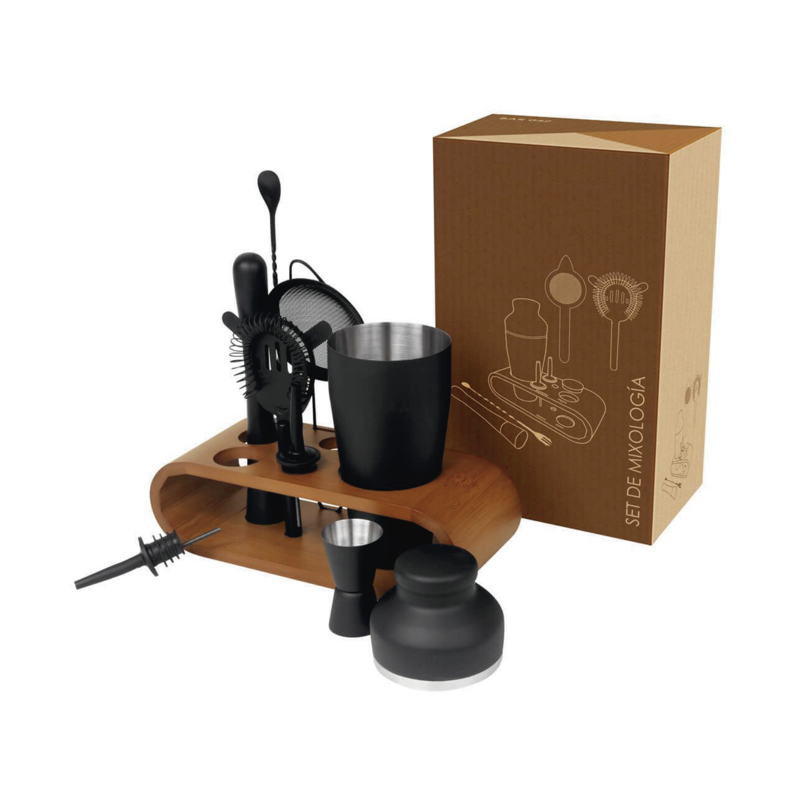 5 X 6 CM SHAKER / 5.8 X 3 CM BASE DE BAMBU / 2 X 1.5 CM DOSIFICADOR / 1 X 2.5 CM MACERADOR / 1 X 2.5 CM FILTRO