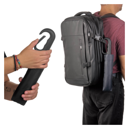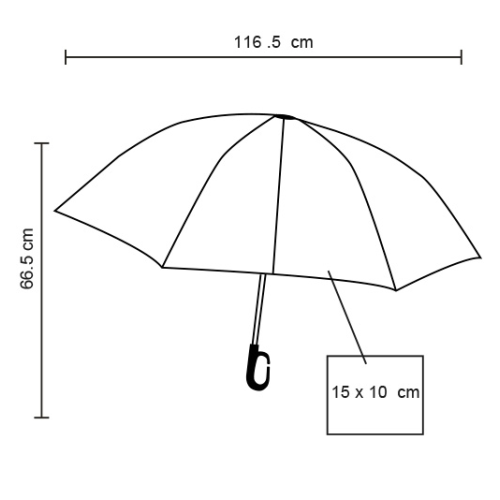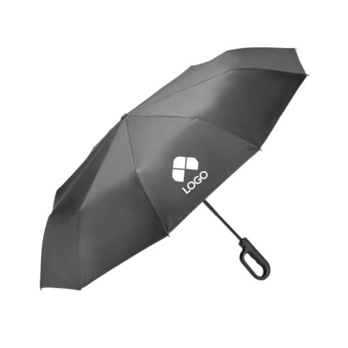 PARAGUAS DE BOLSILLO CON SISTEMA DE APERTURA Y CIERRE AUTOMATICO, 10 GAJOS, BROCHE DE VELCRO, MANGO CON ACABADO RUBBER Y GANCHO PARA BOLSAS. INCLUYE FUNDA