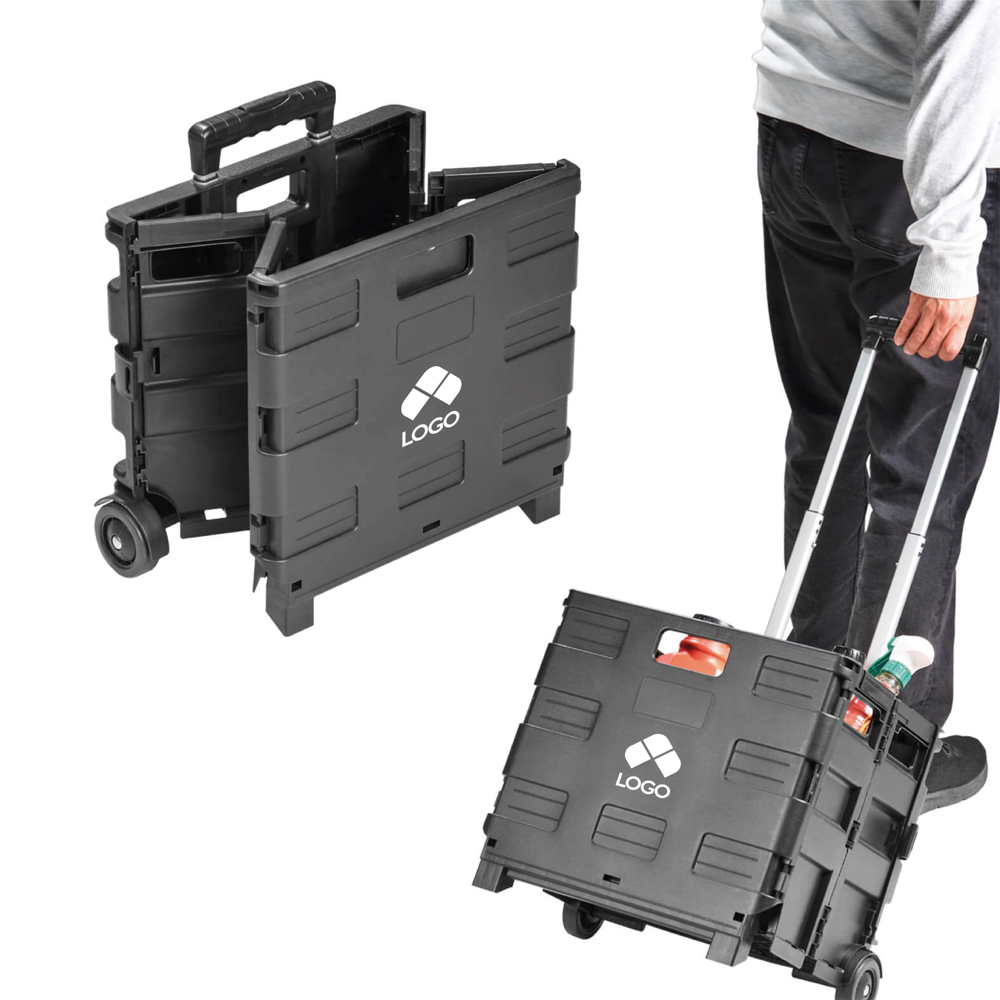 CARRITO PLEGABLE PORTATIL PARA SUPERMERCADO, FABRICADO EN PLASTICO, CON 2 RUEDAS, ASA METALICA RETRACTIL Y SEGUROS A PRESION