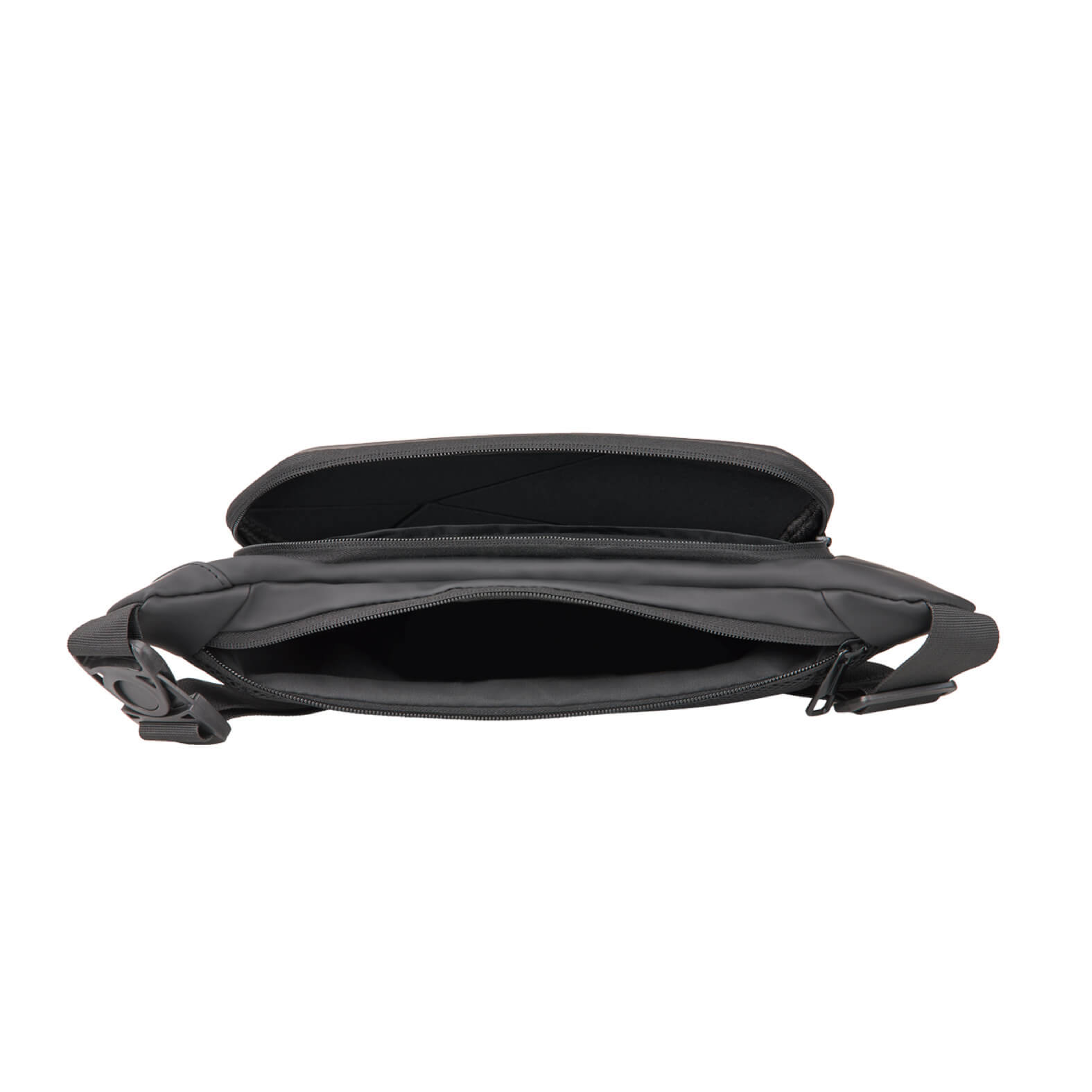 BOLSA DE HOMBRO CON CARCASA DURA, COMPARTIMENTO PRINCIPAL CON ORGANIZADOR INTERNO, BOLSA FRONTAL CON CIERRE Y CORREA AJUSTABLE CON BROCHE