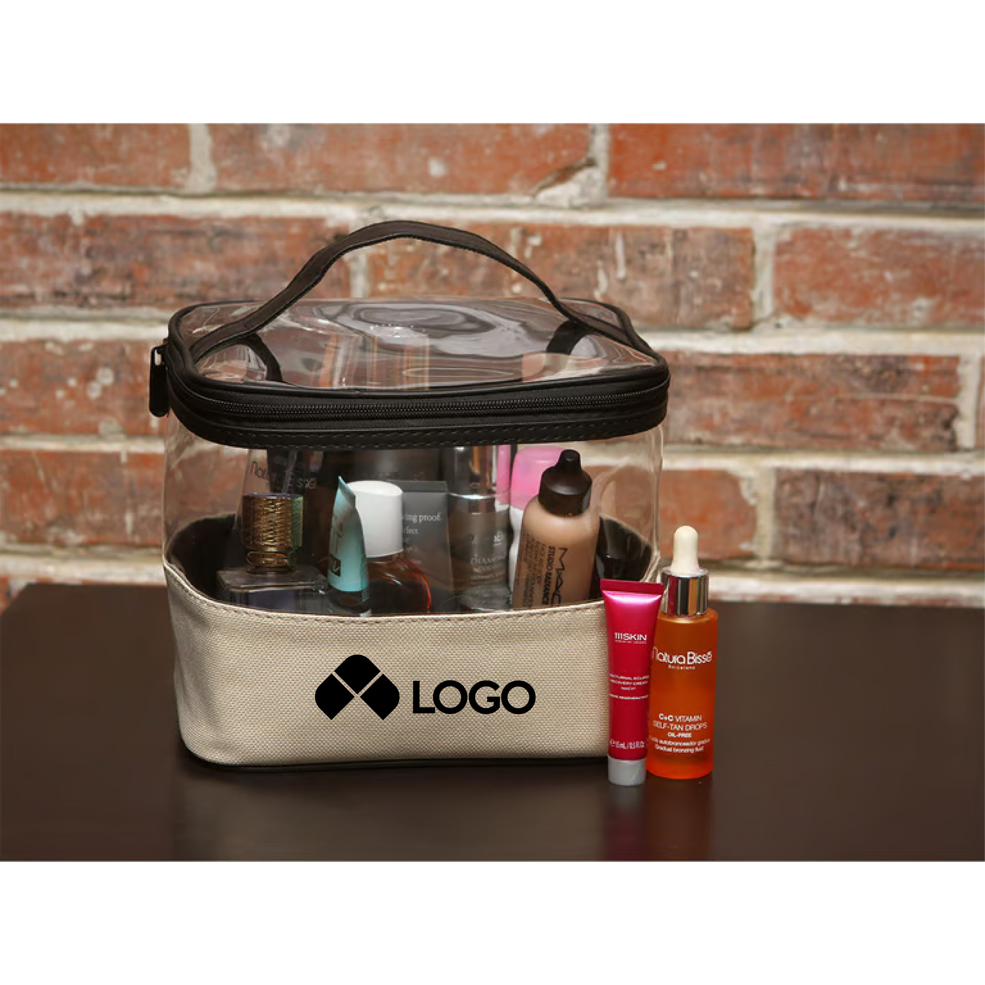 BOLSA TIPO COSMETIQUERA FABRICADA EN PVC, CANVAS Y POLIESTER. CUENTA CON UN SOLO COMPARTIMENTO PRINCIPAL CON CREMALLERA DE DOBLE CIERRE. TIENE UN ASA SUPERIOR PARA UN MEJOR AGARRE Y MANIPULACION