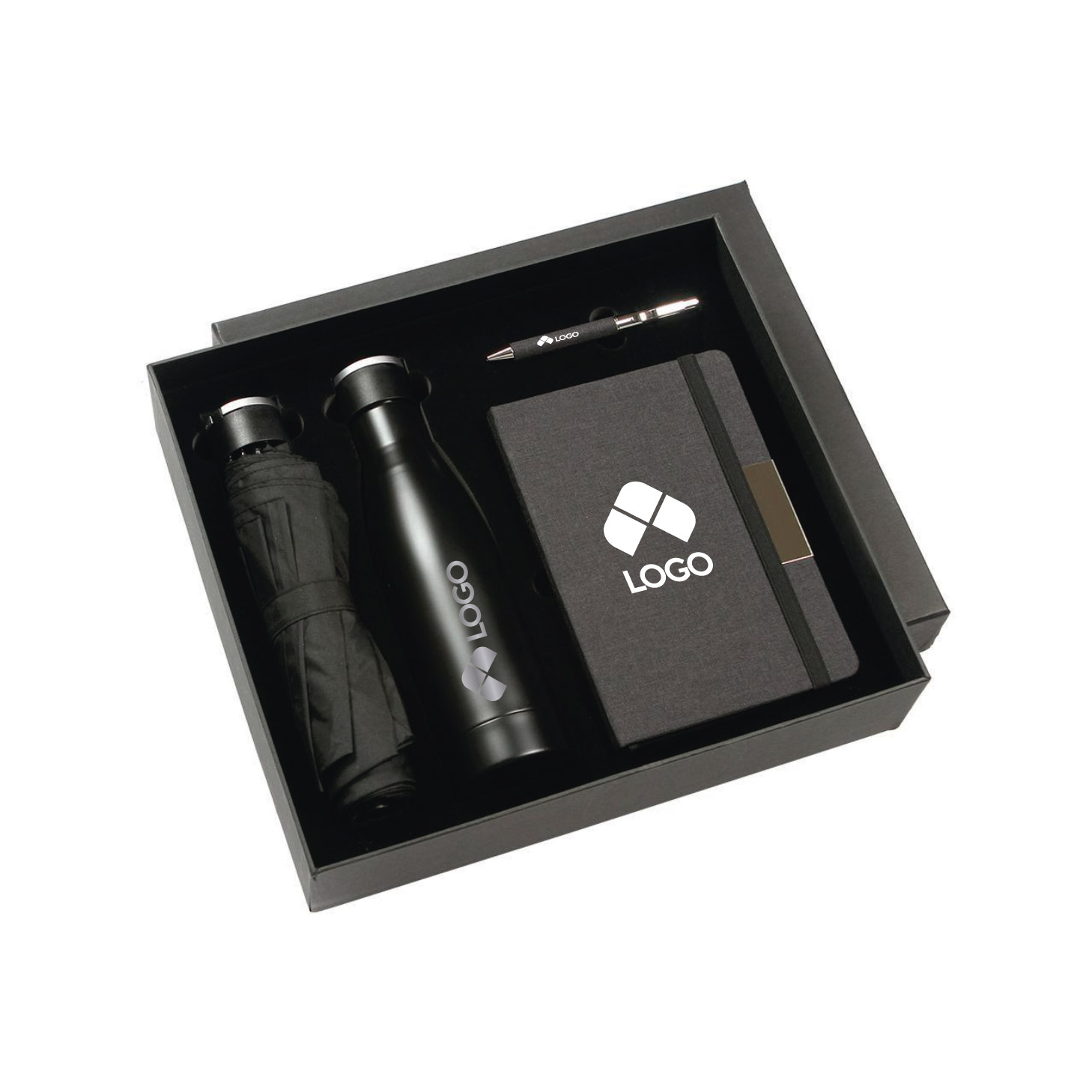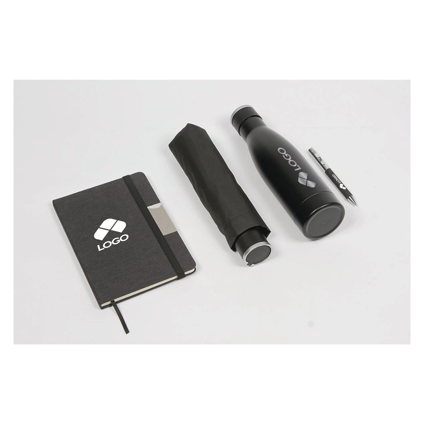 CAJA: 35.5 X 31.5 X 7.5 | LIBRETA: 14.7 X 21.3 X 1.3 | BOTELLA: 26.3 X 7 | PARAGUAS: 25.5X5 | BOLIGRAFO: 13.1X1 CM