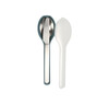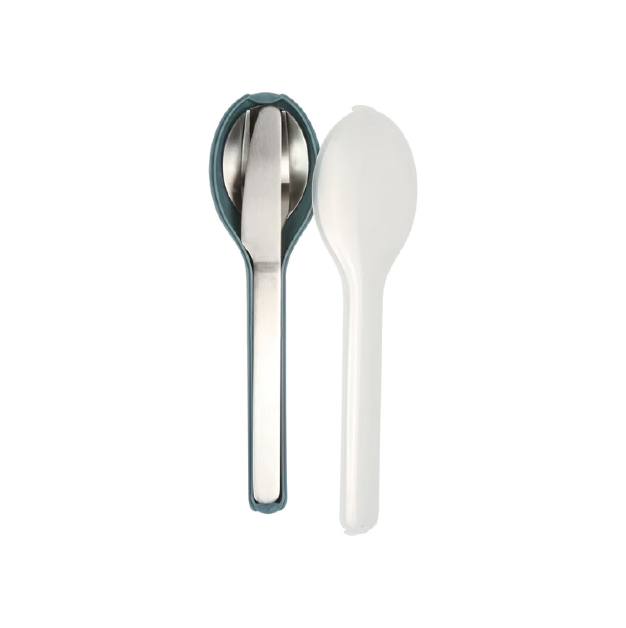 JUEGO DE UTENSILIOS FABRICADOS EN ACERO INOXIDABLE, INCLUYE CUCHARA, TENEDOR Y CUCHILLO. SU ESTUCHE EN FORMA DE CUCHARA FABRICADO EN POLIPROPILENO CON TAPA TRASLUCIDA AYUDA A RESGUARDARLOS MEJOR