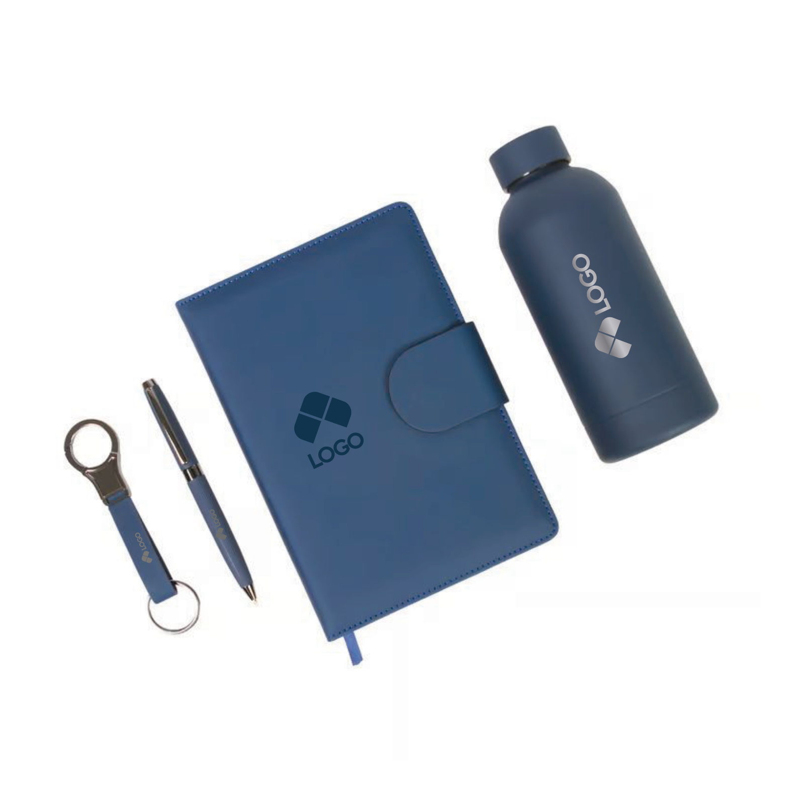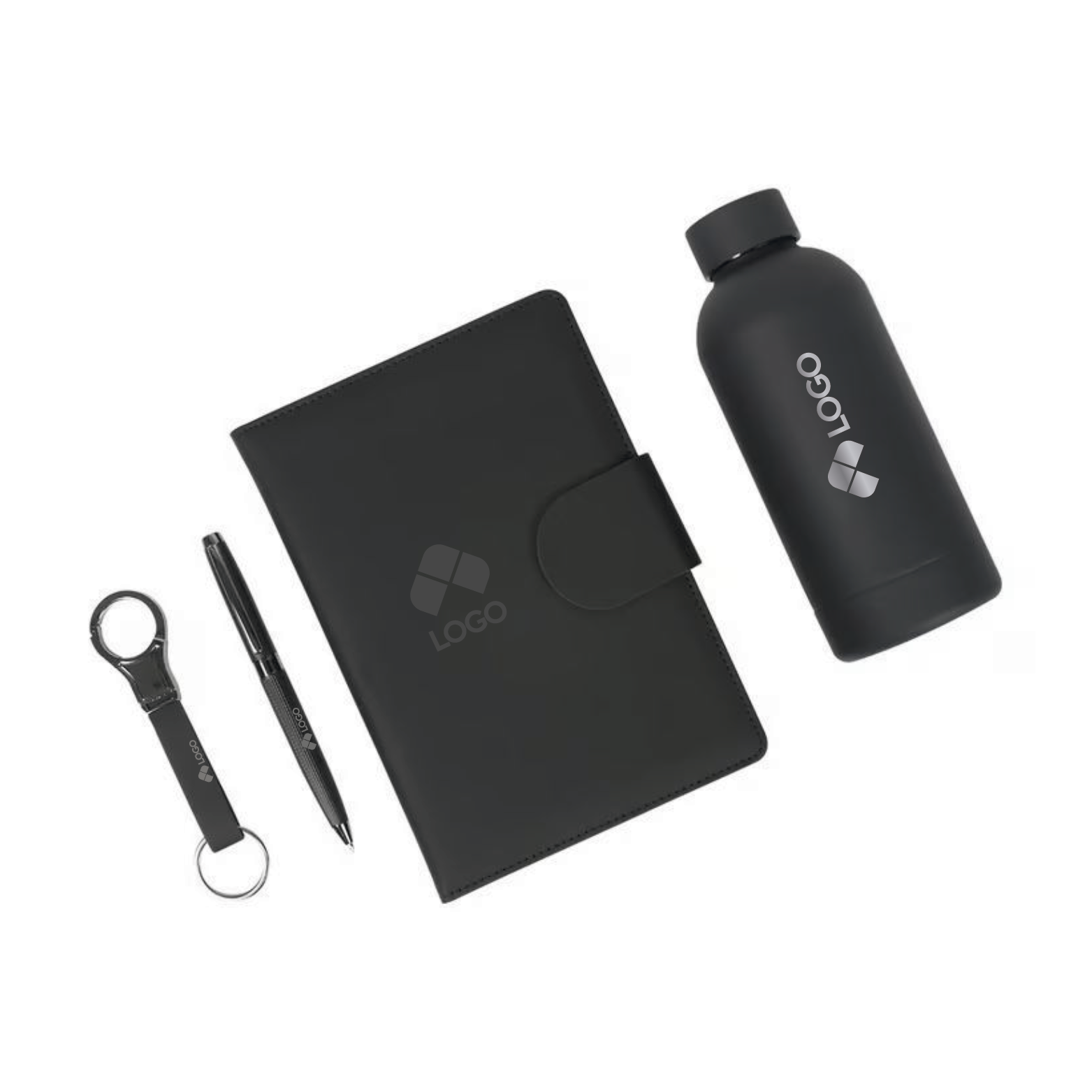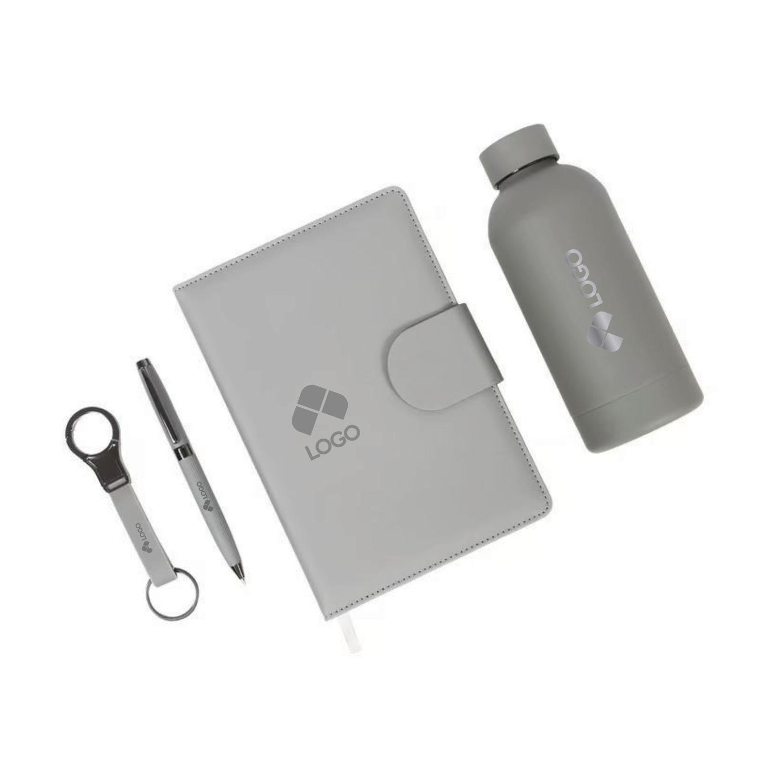SET EJECUTIVO 4 EN 1. INCLUYE LIBRETA DE 100 HOJAS DE 80 G, BOLÍGRAFO TIPO BALL PEN FABRICADO EN ACERO INOXIDABLE CON TINTA DE ESCRITURA EN COLOR NEGRO, LLAVERO FABRICADO EN PU Y ACERO Y TERMO DE 350 ML FABRICADO EN ACERO. ELEGANCIA Y FUNCIONALIDAD EN UN SOLO PAQUETE. IDEAL PARA REGALAR O USAR A DIARIO