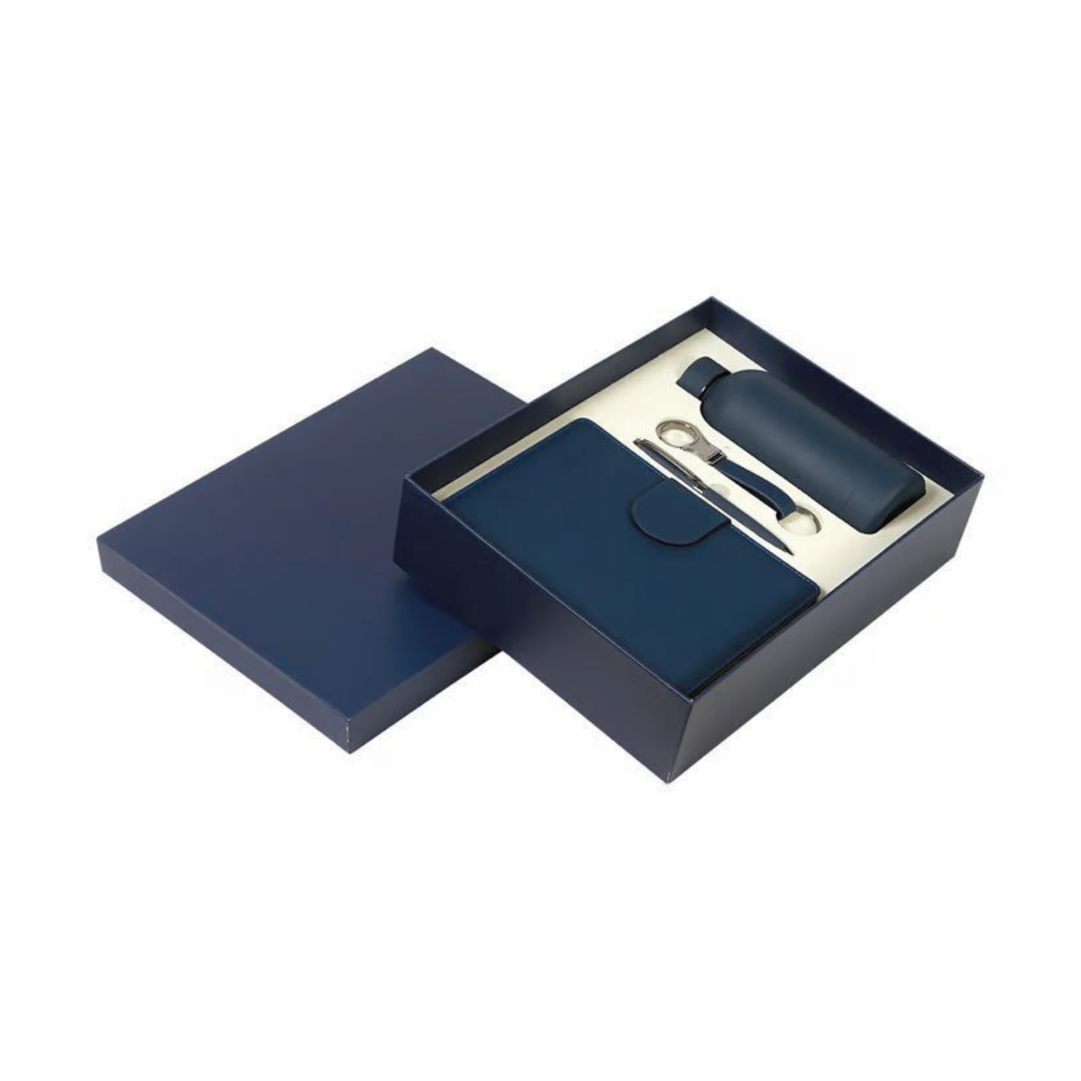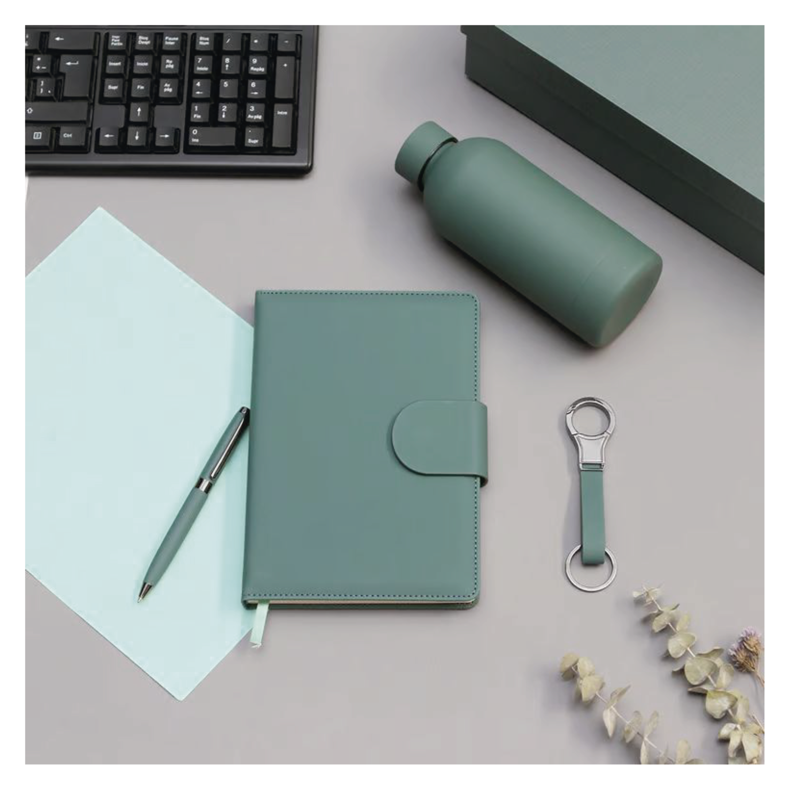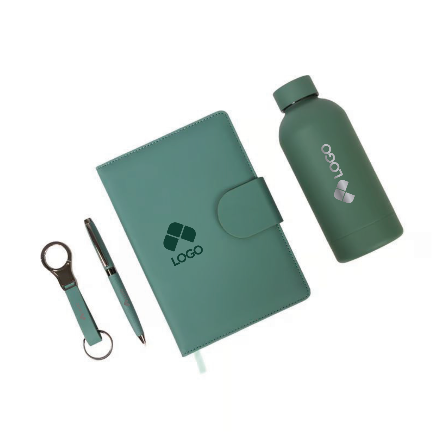 SET EJECUTIVO 4 EN 1. INCLUYE LIBRETA DE 100 HOJAS DE 80 G, BOLÍGRAFO TIPO BALL PEN FABRICADO EN ACERO INOXIDABLE CON TINTA DE ESCRITURA EN COLOR NEGRO, LLAVERO FABRICADO EN PU Y ACERO Y TERMO DE 350 ML FABRICADO EN ACERO. ELEGANCIA Y FUNCIONALIDAD EN UN SOLO PAQUETE. IDEAL PARA REGALAR O USAR A DIARIO