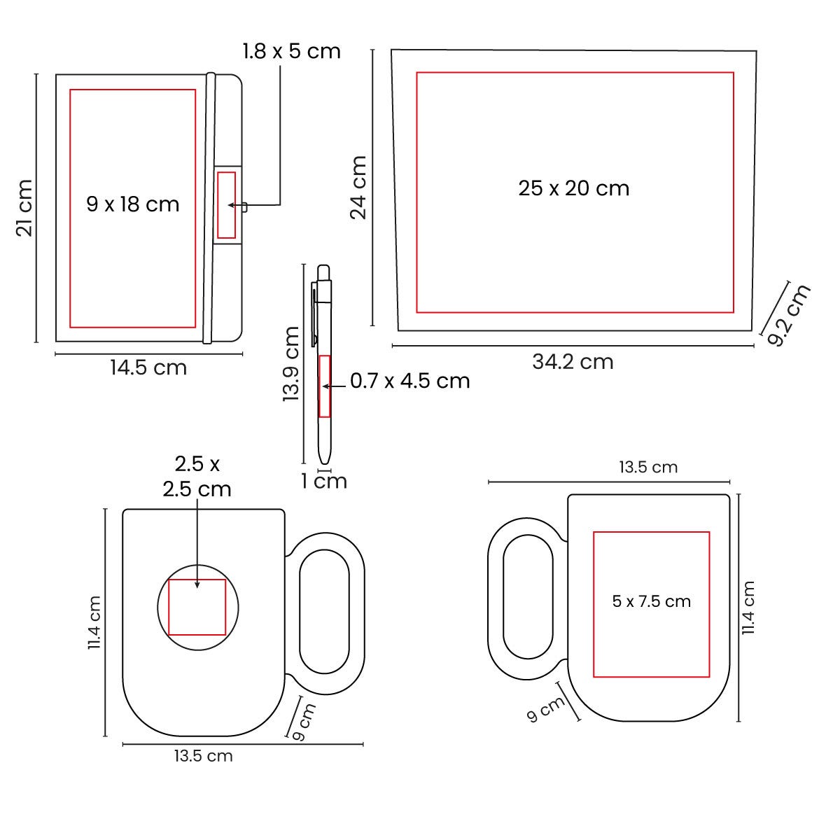 25 X 20 CM CAJA / 9 X 18 CM LIBRETA PASTA / 1.8 X 5 CM LIBRETA PLACA / 0.7 X 4.5 CM BOLIGRAFO / 2.5 X 2.5 CM TAZA PLACA / 5 X 7.5 CM TAZA CUERPO