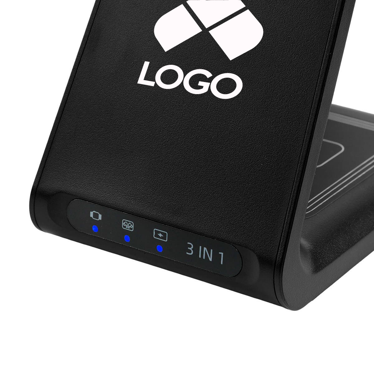 CARGADOR INALAMBRICO CON TRIPLE FUNCION. INCLUYE ESTACION DE CARGA PARA SMARTPHONE, RELOJ INTELIGENTE Y AUDIFONOS, PERMITE LA CARGA SIMULTANEA, ADEMAS LUZ LED INDICADORA DE CARGA ACTIVA. COMPATIBLE CON DISPOSITIVOS DE CARGA INALAMBRICA. WIRELESS DE 15W / 10W / 7.5W / 5W / 3W. INCLUYE CABLE DE 1M CON CONECTOR TIPO. INCLUYE CAJA INDIVIDUAL