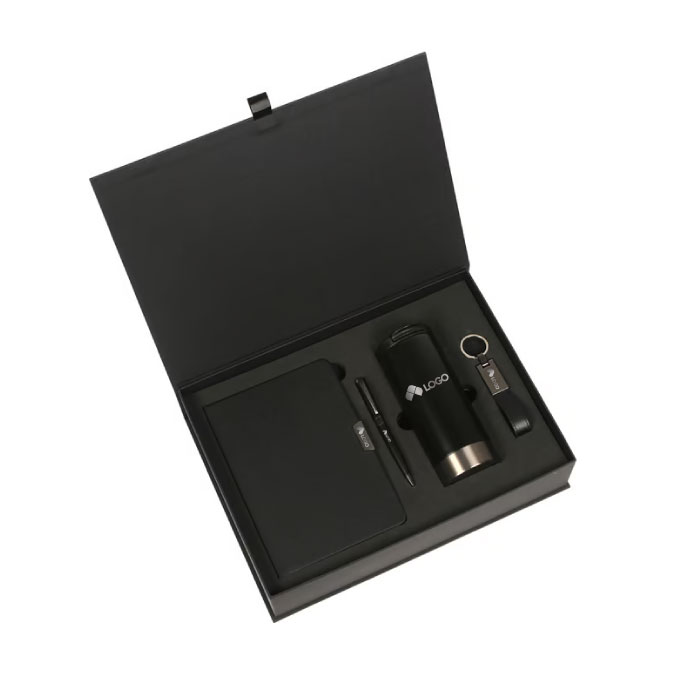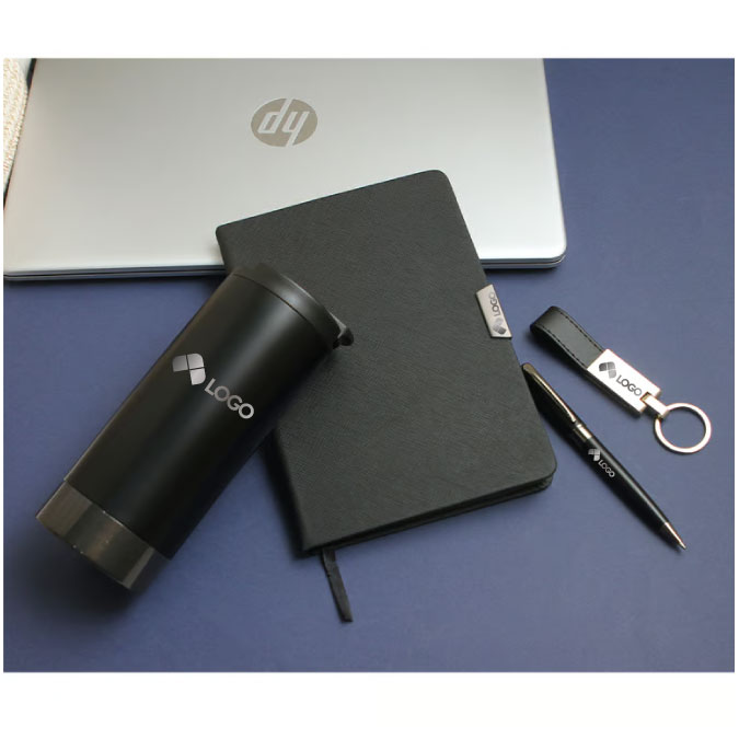 SET EJECUTIVO DE CUATRO PIEZAS, LIBRETA CON 96 HOJAS RAYADAS DE 80 G , BOLÍGRAFO METÁLICO DE GIRO CON TINTA NEGRA, LLAVERO DE ACERO CON DETALLE EN PU Y TERMO DE ACERO INOXIDABLE DE DOBLE PARED CON TAPA DE ROSCA DE POLIPROPILENO CAPACIDAD DE 350 ML / 12 OZ, LIBRE DE BPA. ELEGANCIA Y FUNCIONALIDAD EN CADA DETALLE