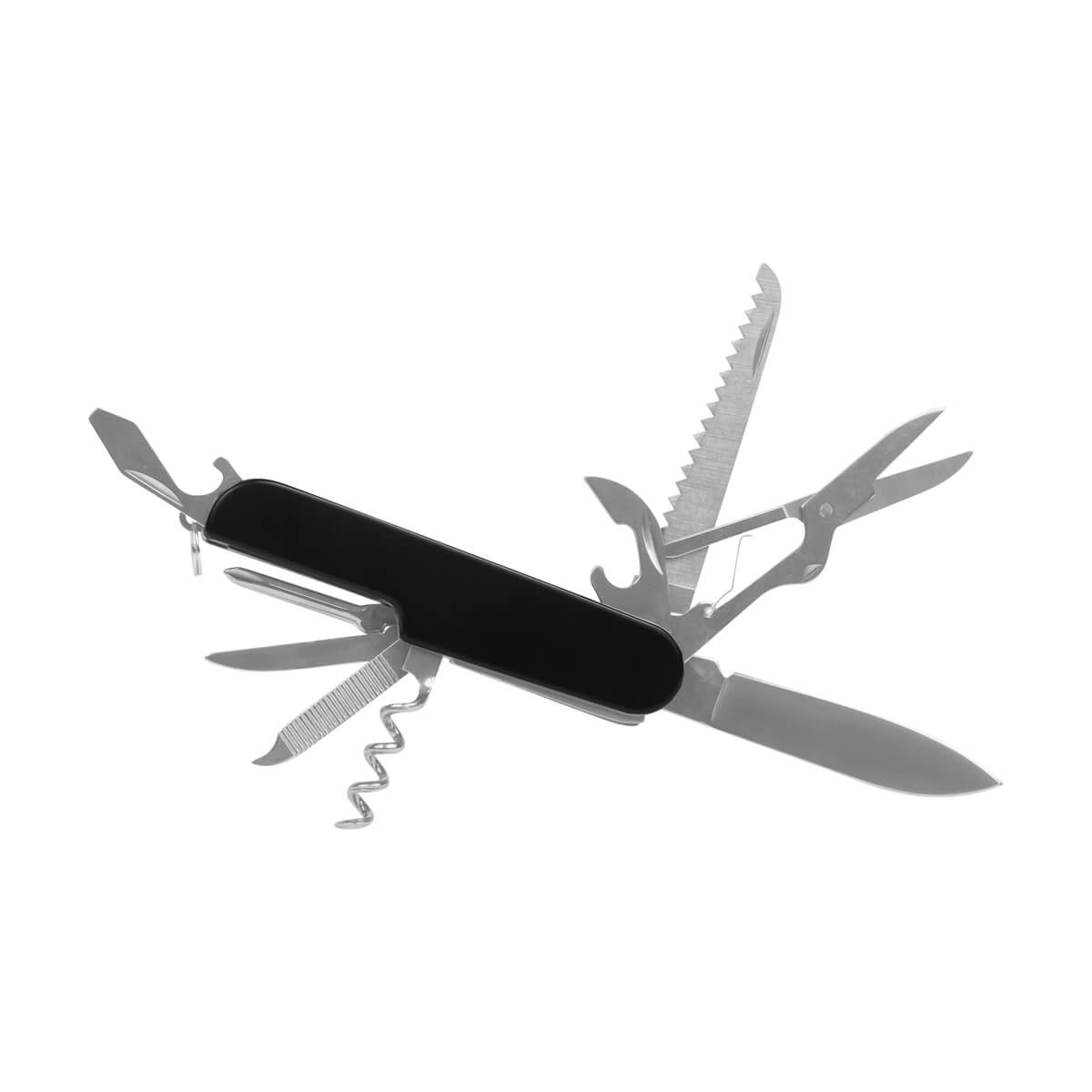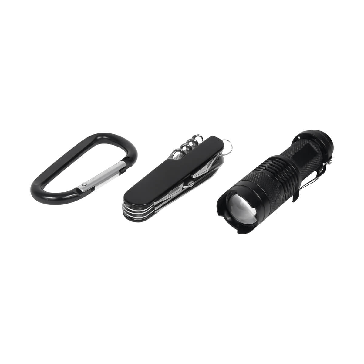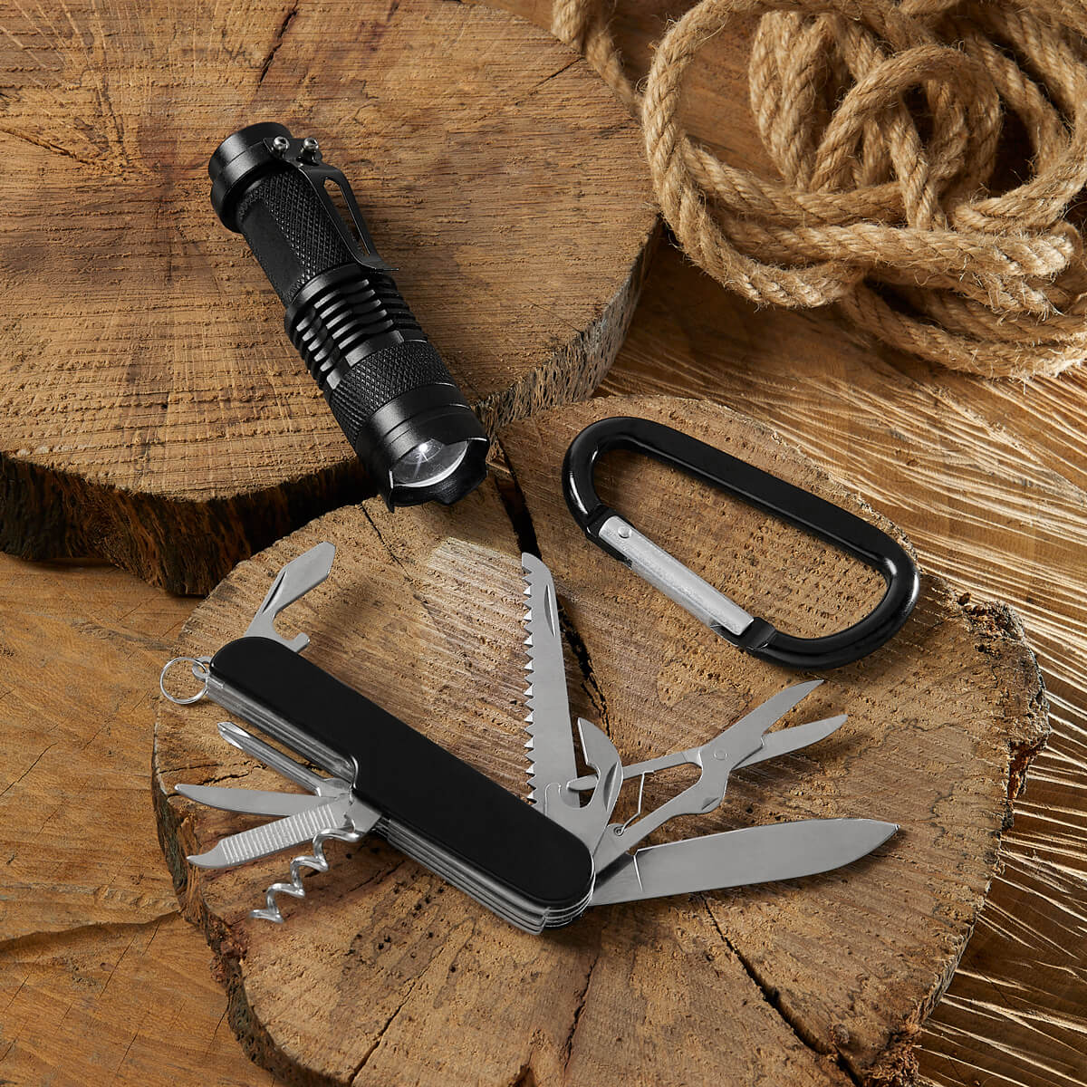 SET DE HERRAMIENTAS MULTIUSOS. INCLUYE GANCHO METALICO, LAMPARA CON LUZ AJUSTABLE Y NAVAJA CON 9 FUNCIONES: (NAVAJA, SIERRA, TIJERAS, DESTAPADOR, ABRELATAS, SACACORCHOS, GUÍA DE HILO, LIMA Y DESARMADOR DE CRUZ). INCLUYE CAJA INDIVIDUAL