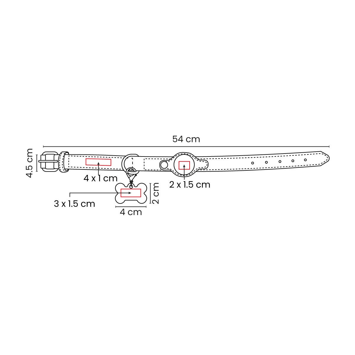 Área de impresión: 4 X 1 CM, 2 X 1.5 COLLAR / 3 X 1.5 CM PLACA