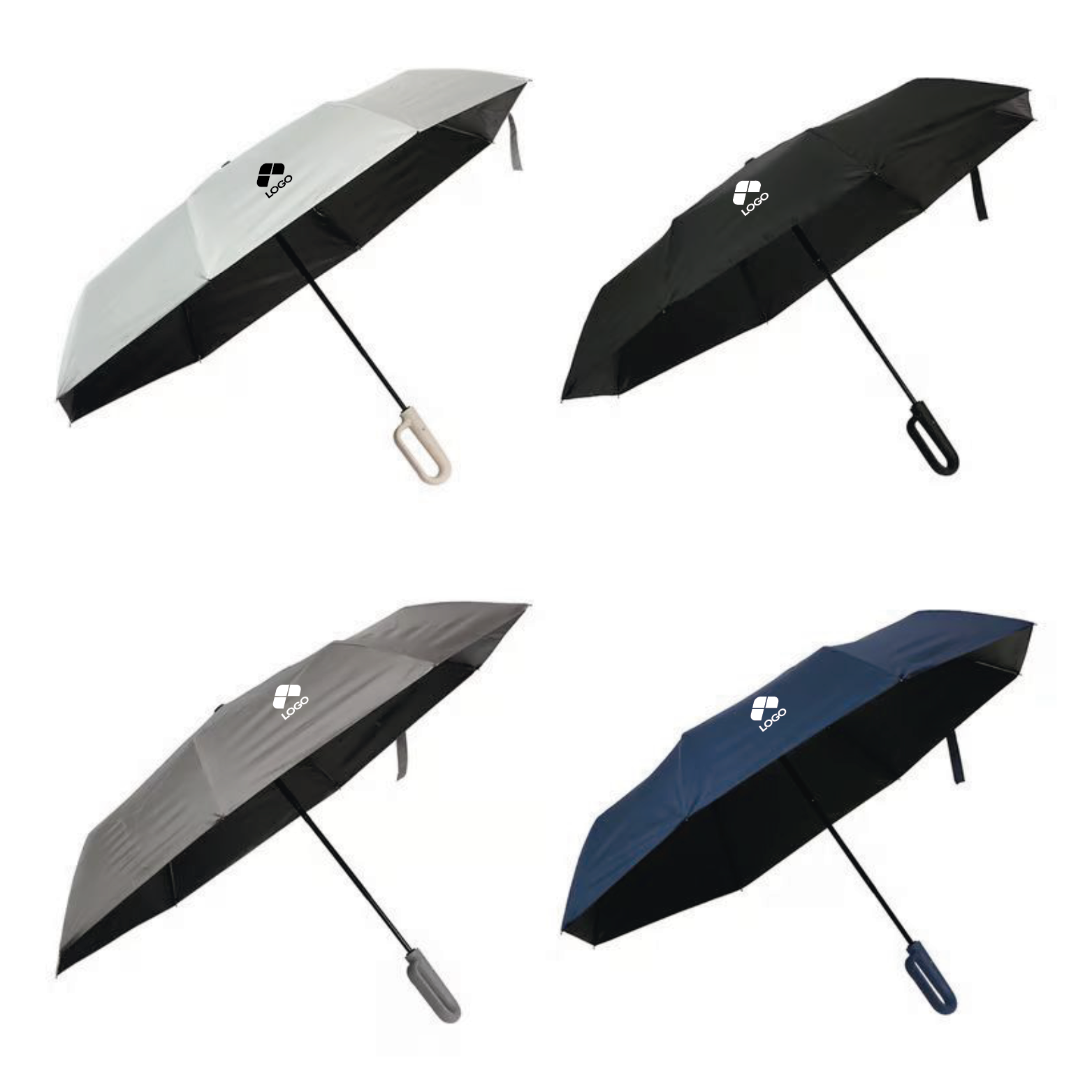 PARAGUAS INVERTIDO BI-TONO AUTOMATICO FABRICADO EN PONGEE CON 8 GAJOS, COLOR EXTERIOR NEGRO CON INTERIORES A COLOR